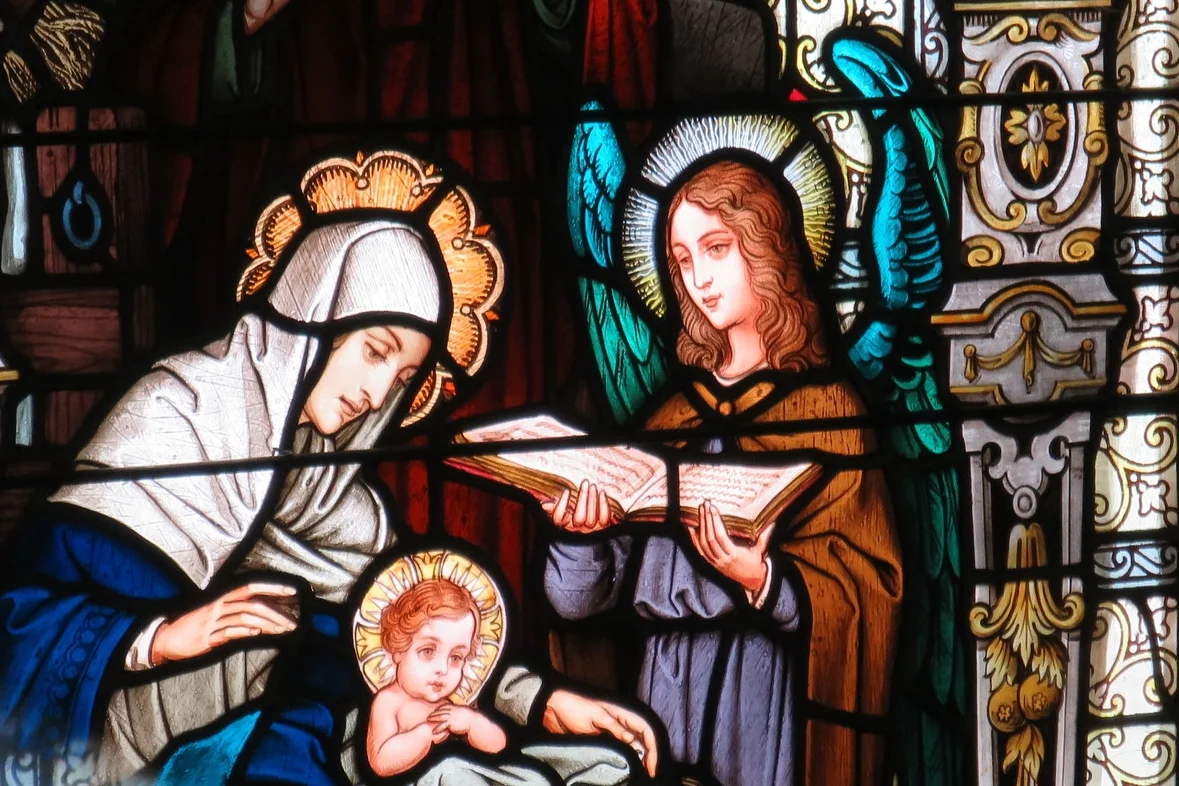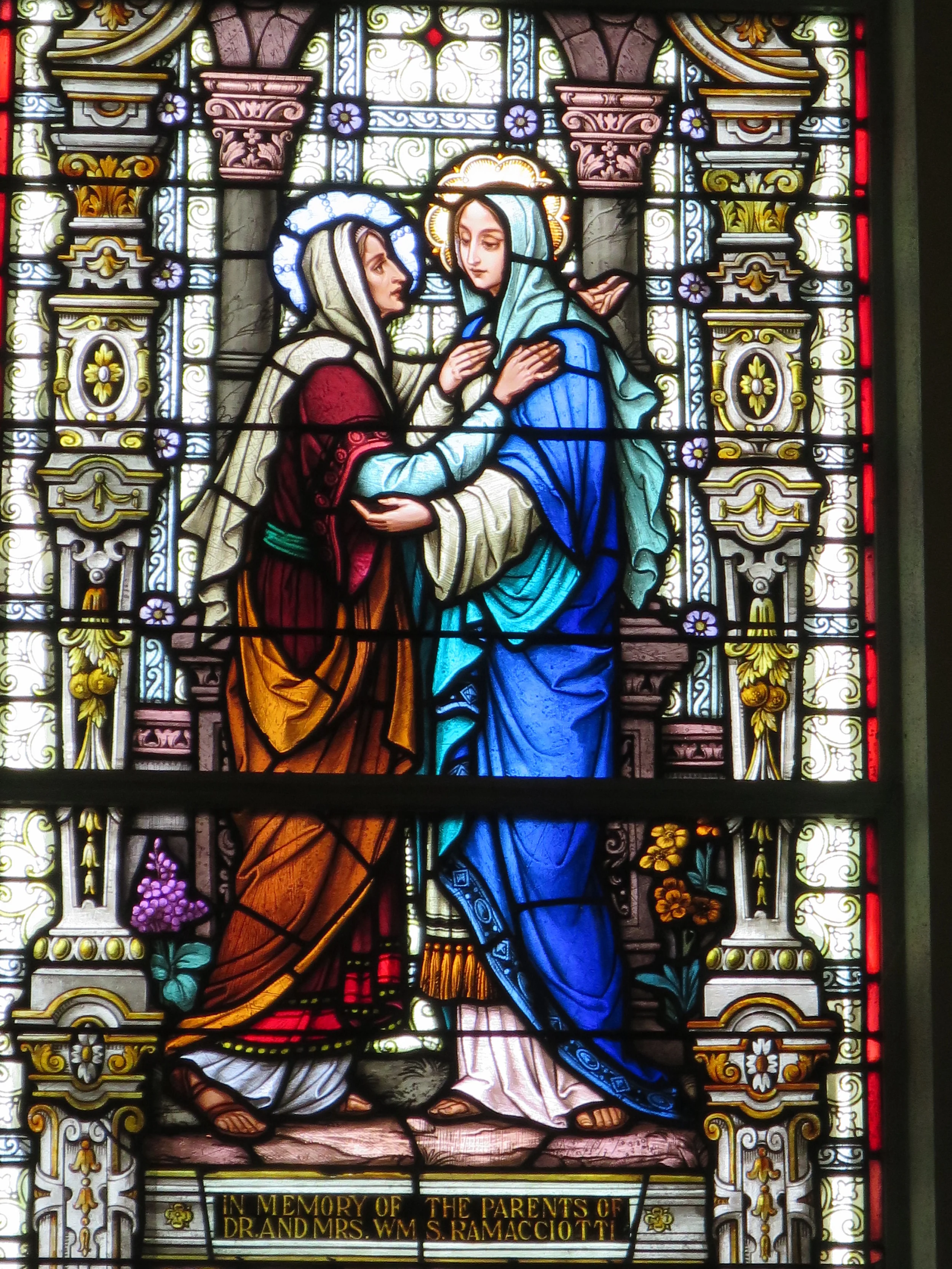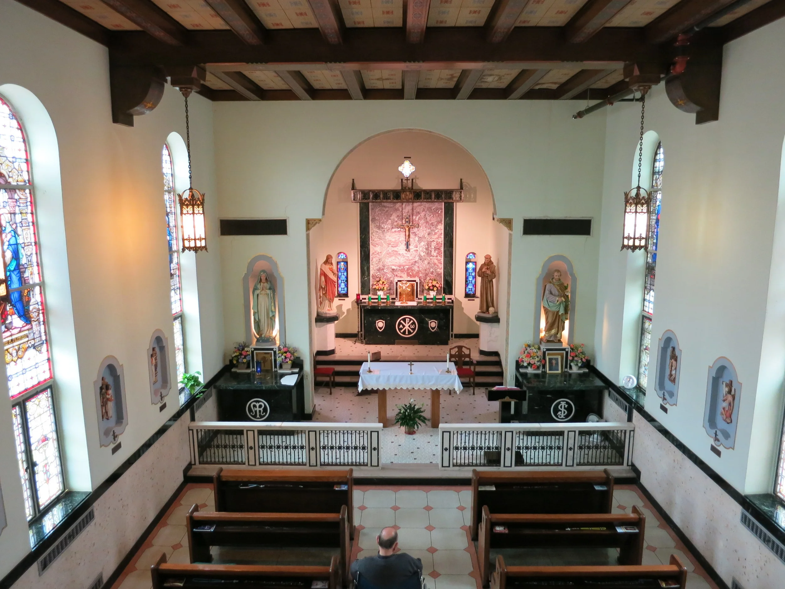 The stained glass windows from St. Mary's Hospital Chapel depict the five Joyful Mysteries of the Holy Rosary, plus a sixth window of Our Lady giving the rosary to St. Dominic. The windows were made by Emil Frei and Associates in St. Louis, MO and date from the hospital's opening in the 1920s.