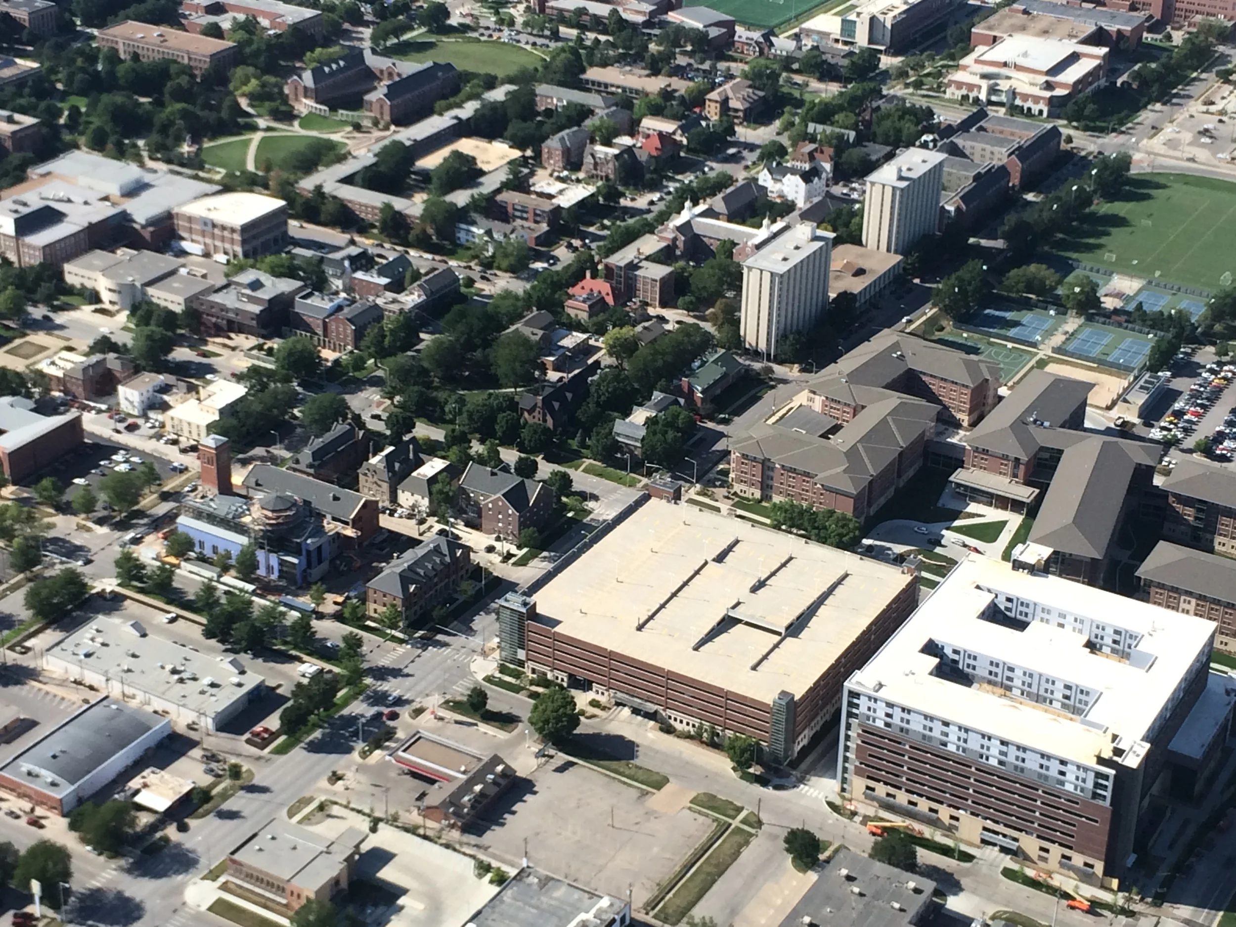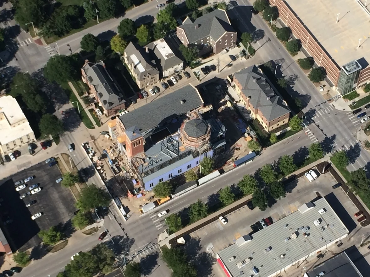 Clark staff member Ilja Sanio recently had the opportunity to take a cessna flight over the city of Lincoln and during the flight he took aerial photos of the St. Thomas Aquinas project. From the images take notice of the roof complete on the north portion of the building, which houses the meeting rooms and offices of the Newman Center as well as the rectory. St. Thomas Aquinas Church occupies the south portion of the building. The Church's construction is phased behind the Newman Center side, where the roof trusses are still being placed and the south side of the building has yet to received all its exterior brick. Rising above the entire complex are the bell tower and the Church's crossing tower. Also visible in the photos is the Phi Kappa Theta Fraternity house, completed by Clark Architects in 2013, which is located to the east of St. Thomas. This vantage point gives a new perspective to an important project for the campus ministry and Catholic community of the University of Nebraska-Lincoln.