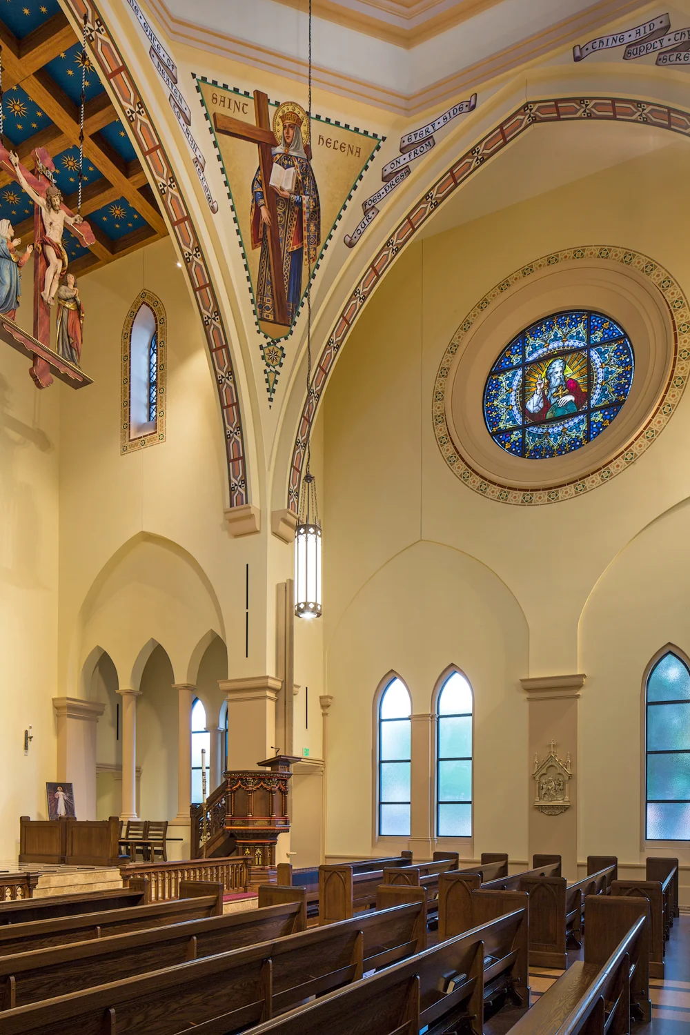 Designed in an English Collegiate Gothic tradition, the narthex is rotated to the center of the building between the Newman Center and the Chapel to provide a single unified entrance as well as providing additional seating in the chapel. An arcade of doric columns line the nave of the chapel. In the north transept, a side chapel dedicated to Our Lady may be utilized for smaller groups, Eucharistic Adoration, and overflow seating for larger Masses. The sanctuary contains antique altars, ambo, reading stand, and presidential chairs that were acquired from Ohio and England. The sanctuary appointments were restored and constructed by Mountain View Millworks - the pieces received decorative paint by Gold Leaf Studios in Washington, DC. Stained glass windows were designed and crafted by Franz Mayer of Munich in Germany. EverGreene Architectural Arts designed the murals and decorative finishes. Dominique Cheenne (C&C Consultants) provided acoustical consultation - resulting in the exceptional aural quality of the chapel.